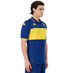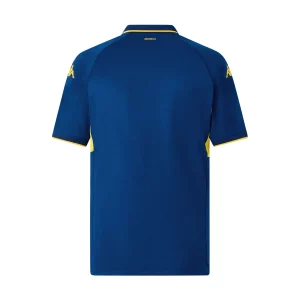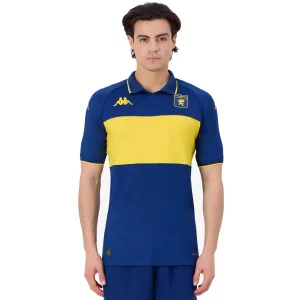 GARA. Maglia gioco KOMBAT™ PRO 2025 da uomo in tessuto elasticizzato riciclato e con tecnologia HYDRO-WAY PROTECTION. SKIN FIT. Manica corta, colletto a polo e inserto sul fondo maniche in costina lavorata, grafica embossata sul fronte, sul retro e sulle maniche. Logo Omini in stampa HD e Team logo in silicone applicati sul petto, logo Omini sulle maniche e lettering del Team realizzati in transfer applicati a caldo. GENOA CFC.